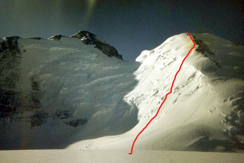 Снова лицом к склону и вниз на три такта. Опасно. Вот вроде мульда. Есть соблазн глиссера. Визуально, где-то внизу, видно выполаживание. А кошки? Кошки надо убрать в рюкзак. Пожалуй, можно ещё метров тридцать-сорок солдатиком с присядкой лицом от склона: опора на штычок ледоруба. Печатаем шаг. Тяжело. Стойка на глиссер. Но до плато ещё дико далеко. А глубина манит. Поехал! Брызги снега. Снова неприятная крутизна. Управлять ледорубом и ногами уже не получается. Всё. Он куда-то летит в свободном падении...