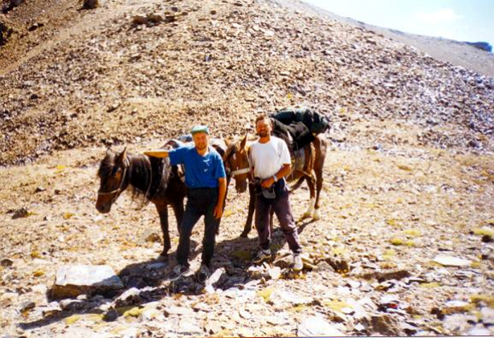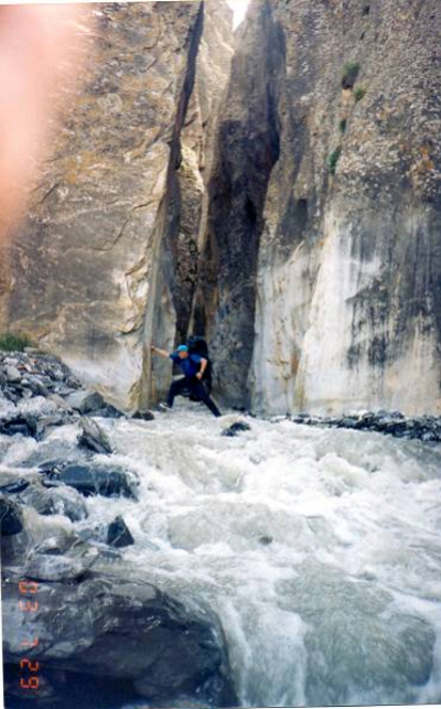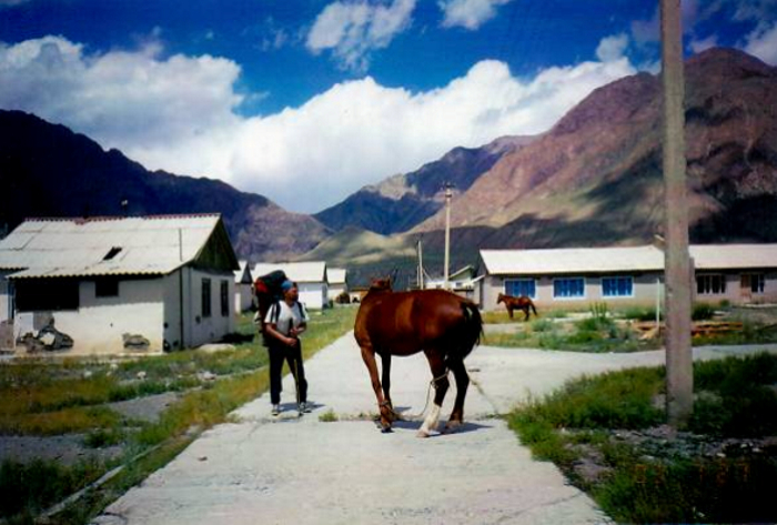 Выспались отлично, мягкий песок, тепло, звезды. На утро делаем радиальные выходы без рюкзаков вдоль русла в право-влево до ста метров и убеждаемся, что переправы нет. Фоткаемся для памяти и с не очень легкими рюкзаками начинаем движение в обратную сторону, к альплагерю Мойда-Адыр. Сначала 2-3 км до впадения р. Каинды в р. Сарыджаз. Сарыджаз - мощная и популярная у водников река и, как многие горные реки, довольно опасная. Нам дальше вверх-вниз вдоль реки 10-12км, с обязательным заходом для купания на радоновые источники. Потом - посещение п. Иныльчек, где еще пятнадцать лет до этого кипела жизнь, а теперь остались лишь бараки и неприкаянные, но упитанные лошади.