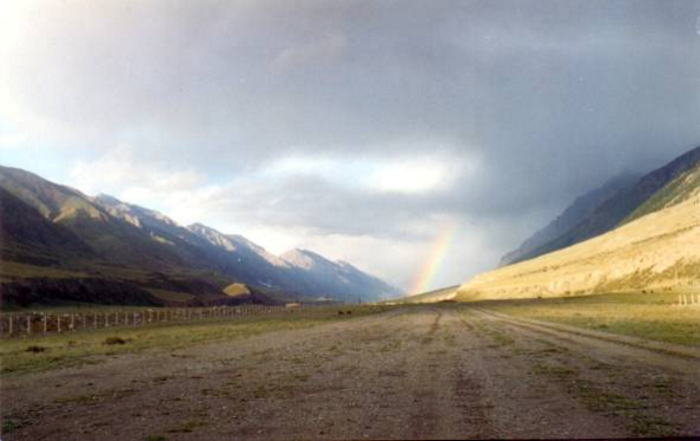 Перекусив, идем еще 20 км по дороге вдоль русла р. Иныльчек мимо разрушенных многоэтажек поселка, бывшего, покрытого бетоном аэродрома, мимо погранзаставы и, под красивый цвет радуги после дождя наконец-то прибываем в конечный пункт нашего маршрута: к теплу, уюту, еде и к новым знакомым. Хотели мы того или нет, но статус "своих" мы уже заработали.