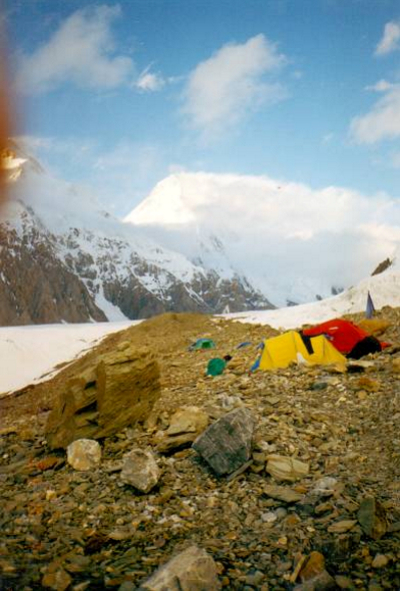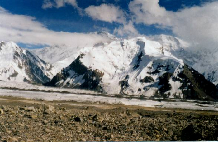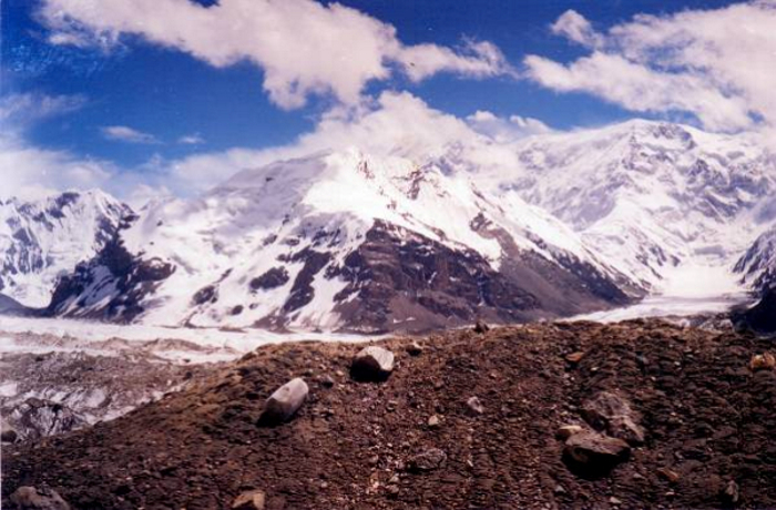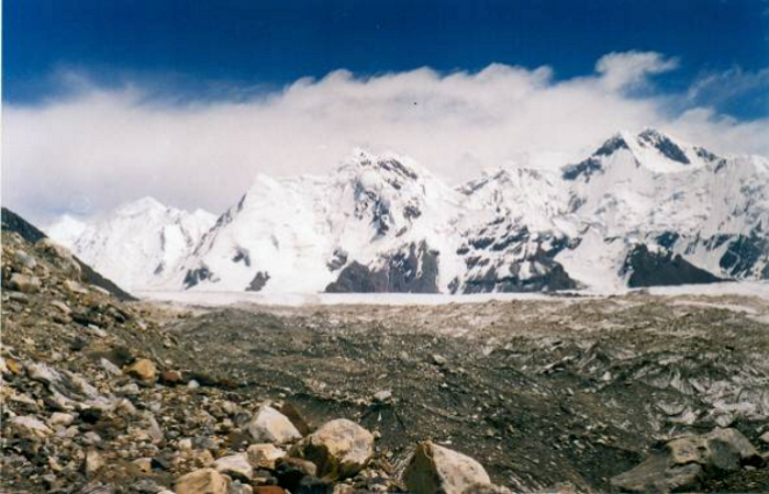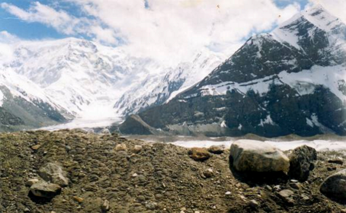 Итак, после трех мало предсказуемых дней, из-за сложного ледникового рельефа нам пришлось выбрать для себя вариант передвижения на стыке подошвы хребта Тенгри-Таг и ледника Южный Иныльчек. Вариант, безусловно, затратный. Видимо, есть и попроще. Но нам выпал этот. Крутизна склона несколько "упала", и перспектива ледника просматривалась в даль километров на десять. Ширина ледника, напомню, около трех километров. Шли по формуле: "идти нельзя остановиться". Где ставить запятую, пока сообразишь, можно свернуть шею. Ровных участков - ноль. Скальные, смерзшиеся боковые морены до 1,5 метров высотой, которые невозможно обойти, а при попытке преодолеть "в лоб" соскальзываешь на мокрых камнях и снова ищешь вариант, куда поставить ногу и не получить травму. Мозг занят только этим, напряжение - максимально, пот заливает глаза, красоты ледника и противоположного склона хребта Кокшаал-Тоо нам пока "не по карману". Их мы смогли, как следует рассмотреть, только проявив фотопленки.