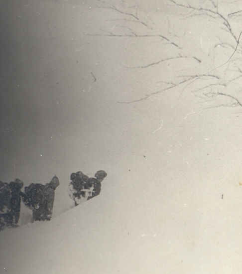 После днёвки под перевалом было решено сходить ещё на вершинку по маршруту 1Б в том районе ГКХ, откуда до сих пор непонятным мне образом нам предстояло спуститься по другому маршруту и попасть в другой населённый пункт, откуда благополучно уехать во Владикавказ. Никаких описаний маршрутов подъёма и спуска с вершины у нас не было, детальной карты района не было, и группе приходилось полагаться на "безоговорочный" авторитет руководителя, который уверял, что он и карты изучил, и район в целом ему знаком. От нас требовалось только "вперёд и вверх, а там…". Что мы, собственно, с удовольствием старались делать. Поутру, когда началось выдвижение в сторону вершины, было пасмурно. Но если кто-то из нас в тот момент чего-то и опасался, ну там, лавин или просто возможности заблудиться на подъёме, то или не подавал вида, или просто гнал от себя неудобные мысли. Что и говорить: у Юрки был талант убеждения отключать всяческие сомнения. Тактически подъём на вершину поначалу напоминал подъём на перевал. Шли с рюкзаками. Постоянно тропили снег, который на тот момент казался нам довольно глубоким, сантиметров 30-40. Видимость становилась ограниченной. Впервые за весь поход пошёл мелкий снег. К нему добавился ветер, который по мере набора высоты только усиливался. Последние метров сто перед выходом на гребень уже "рубились" по несложным скалам, кстати, довольно дружно, между тонкими струйками снеговых ручейков, стекавших по склону крутизной градусов сорок. На данный момент прогнозы Машненкова пока подтверждались. Это была обычная горная 2А, для зимы. На альпинистскую 1Б склон если и тянул, то с некоторой натяжкой. На вершине мы были около четырёх часов дня. Высота, скорее всего, была в районе 4000м. Существует фотография, на которой десять счастливых (долго думал) человек, уставших, заиндевевших, стоят с поднятыми ледорубами, отмечая покорение чего-то там в метели. Это были мы. Дело оставалось за малым: быстренько спуститься. Погода на глазах портилась. Видимости окрестностей не было никакой. Наспех перекусив, группа рванула в сторону предполагаемого спуска и… оказалась на краю пропасти. По крайней мере, из за сумерек и разыгравшейся метели дна этого скального обрыва не было видно. Возвращение по пути подъёма в планы группы не входило, да и наши следы в метель затянуло так, что в наступивших сумерках мы тупо на склоне рисковали заблудиться. Выбора не было. Решили ночевать на вершине в надежде, что за ночь распогодится. Вершинная площадка была довольно просторной, я бы даже сказал: для вершины слишком просторной, не менее чем 10*10 метров. Палатки у нас тогда были "супер", из обычного брезента. Мы их поставили входом друг к другу, чтобы, не вылезая, приготовить общий ужин и в условиях нависшего урагана общей группой комфортнее его переждать. Все держались очень "молодцом". Травили байки, шутили. Олег даже пытался играть на гитаре. На вершине с гитарой ночью - анекдот ещё тот. А тут - жизнь. К полуночи ветер стал дуть с такой силой, что грозил порвать палатки, поэтому стойки решено было убрать вообще . Так ночь и лежали, в брезентовых мешках, пытаясь хоть как-то согревать друг друга собственными телами. Уставшим, нам всем как-то удалось по три-четыре часа поспать. Это была пятая или шестая ночь нашего пребывания на маршруте. Наутро картина поменялась не сильно. Ветер чуть осла