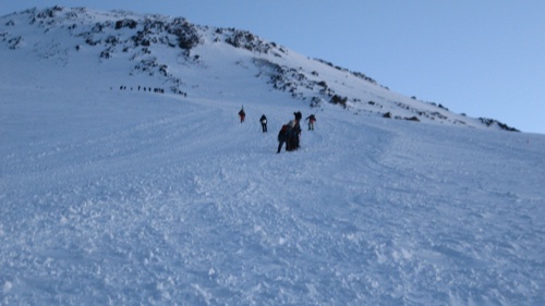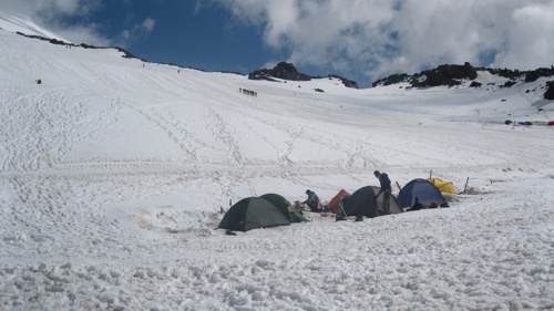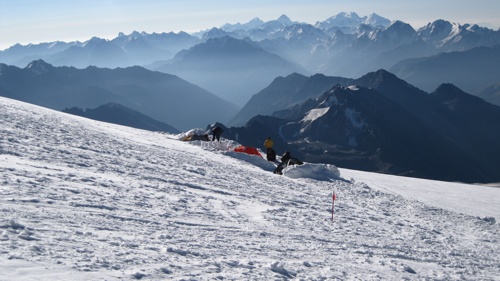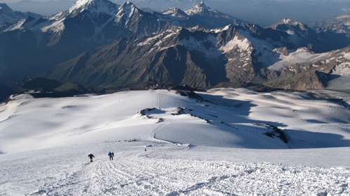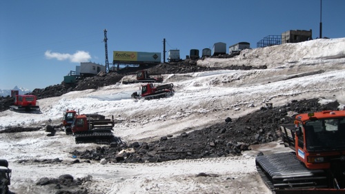 Правда, по сравнению со склонами ущелья Адыл-Су склоны Эльбруса, куда ещё предстояло "отмотать" полтора десятка километров от нашего лагеря, держались молодцом. Холод высоты, ветра и фирн заняли круговую оборону. Видимо, поэтому народищу там - тьма, особенно - ратрачного. Катаются от Бочек до Приюта, а то и до скал Пастухова. Приехали, поиграли в снежки, и опять вниз, до пива. Конечно, это самые первые впечатления. "Канатка" так же изобилует разнообразием творческих наклонностей человеческих индивидуумов. Поднимаясь от поляны Азау на Старый Кругозор, стал невольным свидетелем беседы в вагончике по телефону молодого человека очень колоритной наружности. "Здорово, братан. Где я? Да я на Эльбрусе, еду на канатке, типа, иду, наверх, прохожу акклиматизацию". Другой, почти там же, по сотовому партнёру по бизнесу: "Нет, приехать сейчас не смогу... Да, за границей, в Италии. Да, на море загораю". В "гостиницах" на 4100 м, публика уже совершенно другая. Правда, точнее, наверное, сказать, что во многом публика та же, только ведёт себя совершенно по-другому. Здесь люди собрались со всей измученной цивилизацией Евразии, чтобы на короткое время погрузиться в атмосферу избранности, риска и духоподъёмности. И заодно поучаствовать в ярмарке спортивной одежды разных стилей и направлений. Жизнь в приютах течёт себе неспешно. (Речь будет идти о гостинице, которая бывшая дизельная бывшего Приюта 11-ти.) Один сон-час чего стоит. Середина рабочего или просто светового дня, а на втором этаже хижины весь народ, поголовно, спит как малые дети. Спальников штук двадцать - тридцать. Как будто снотворного наглотались или всю ночь в преферанс играли. Проходят акклиматизацию? Я тоже так почему-то подумал. Но на первом этаже кипит жизнь "со смыслом". Все обитатели - в поисках воды, еды и приятных собеседников для общения. Особые впечатления у меня остались от большой группы туристов из Санкт-Петербурга. Где-то человек двадцать пять. В основном студенты. Такие крутые ребята, и не очень, молодые и …очень молодые. Они в тот день уже успели довольно успешно взойти на вершину и не стеснялись давать выход своим положительным эмоциям. Женская половина этой компании - отдельная тема. Вот какая, по-вашему, вещь - самая главная из атрибутов комфорта высокогорного жилища? Исправные газовые плиты на кухне? Наличие электричества в тёмное время суток? Тёплая кровать? Вот-вот, стареешь, брат. Молодые ленинградки преподали всем живой урок, что исключительный по важности предмет высокогорной хижины, правильно, - зеркальце! Правда, пока оно там довольно убогого вида. Но, надеюсь, МЧС исправит эту недоработку. Спросите: причем здесь МЧС? Есть же хозяин приюта… . А выглядеть растрёпой на восхождении разве не чрезвычайная ситуация? Согласитесь, есть над чем подумать. И ещё. Там у них была такая… главная. Командирша. Уже перед спуском вниз всё ходила по комнатам и девчонок "строила". "Девочки, не забывайте свои вещи. Девочки, не забывайте убрать за собой мусор". На что девятнадцатилетние дарования, смазывая помадой в рассветных сумерках у зеркальца свои слегка засохшие губы, одновременно уверенным жестом поправляя на плече чуть сползающий пятнадцати - килограммовый рюкзак: "Сейчас, Мари Иванна (условно), будет сделано". Ага, щас, будет она менять дело на безделье. В тот же день эта группа ушла на "Азау", оставив пр