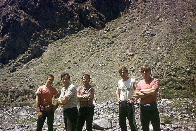 Сейчас уже точно трудно сказать, знали ли мы накануне сборов о трагедии на "Сковороде" пика Ленина при землетрясении в 1990-м году. Скорее, что-то знали. Но тогда в г. Ош, на базе МАЛа, старший тренер, Ю. Беркович, (на фото №2 второй слева) нам объяснял, что первое восхождение на пик Ленина мы должны совершить через скалы Липкина прежде всего потому, что это спортивно, престижно. А чужие палатки, верёвки, тропёжки и пр. - совсем не наш случай. И с нашей амбициозной программой (3-и по 7000+) другого варианта на "самом лёгком" семитысячнике просто не может быть. Такой подход определённым образом развеивал некоторые наши сомнения, нас окрылял и "звал" на спортивные "подвиги". Ботинки были ещё те, однослойный вибрам. Кошки - от ВЦСПС. Одежда от "культур -мультур". Плюс бензин и примусы "Шмель". Но мы были "дети эпохи", и на огромное желание поймать свою спортивную "жар-птицу" нам жаловаться совершенно не приходилось.