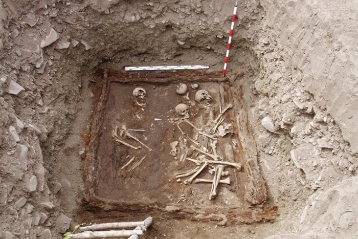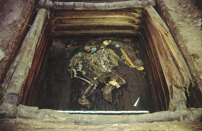 На полу в центре сруба лежали останки двух погребенных - мужчины и женщины. Головами они ориентированы на северо-запад, тела уложены на левый бок с согнутыми ногами. Левая рука каждого вытянута перед туловищем, правая - согнута в локте. Такая поза обычна для захоронений скифского времени Тувы. Черепа погребенных к моменту расчистки были перемещены, вероятно, из-за разложения подушек, на которых они лежали. Не смотря на равнозначное размещение (центральная ось могилы проходит между скелетами), по характеру сопроводительного инвентаря можно предположить, что основным являлся правый погребенный - мужчина. То, что второй скелет положен за спиной первого, также указывает на это. Сразу необходимо отметить, что сохранность костей в могиле очень плохая. По-видимому, это обусловлено процессами гниения и разложения органики внутри не заполненной землей погребальной камеры. Не сохранились, также, предметы и одежда, изготовленные из текстиля, кожи, войлока, меха и шерсти, несомненно присутствовавшие в могиле. Однако, погребальное убранство захоронения было настолько насыщено золотыми украшениями, что тщательная фиксация их расположения сделала возможным воссоздание костюмов и многих других атрибутов царских похорон.
