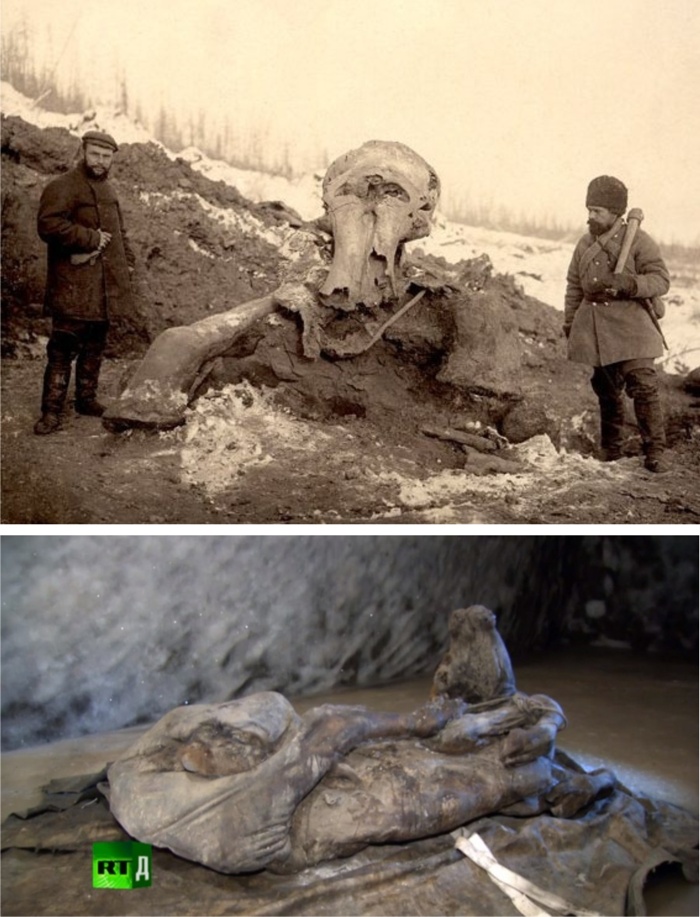 и найденная в 2011 году в Восточной Сибири туша Юкагирского бизона (нижний снимок)