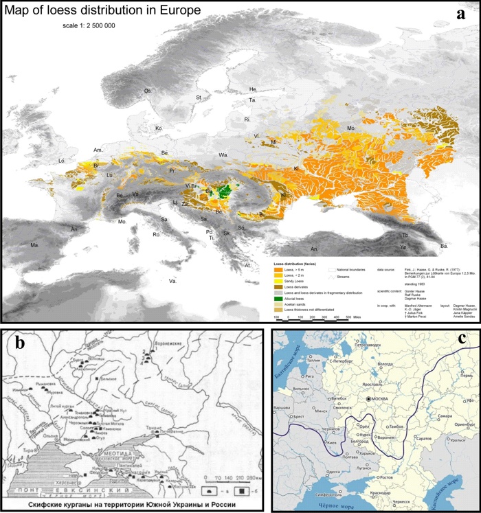 Давайте кратко рассмотрим географическую позицию скифских курганов и вероятную геологическую историю их образования. Как было ранее сказано, они протянулись широкой полосой по территориям Украины, Казахстана и юга России от Днестра до Монголии. Если сопоставить схему распространения курганов (Рис. 5b) с картой лёсса в Европе (Рис. 5a), то можно заметить, что курганы располагаются преимущественно на территориях распространения лёссовых отложений, осаждение которых происходит из тонкой взвеси в медленно движущейся или стоячей воде. При этом северная граница этих отложений совпадает с границей «максимального распространения покровного оледенения» (Рис. 5с), связанной с резким падением скорости водного потока, где и произошел сброс тяжелых осадков.