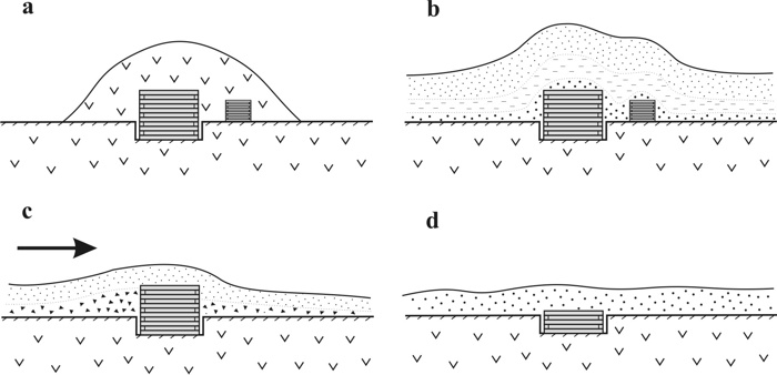 Курганный рельеф, связанный с отложением осадков на неровную земную поверхность, на которой стояли сооруженные скифами строения, мог образоваться только при медленном движении водного потока и/или стоячей воде (Рис. 6b) и, главным образом, на равнинных приморских территориях. В этом случае, и насыпь кургана, и окружающее курган пространство, состоят из одинаковых пород, причем кардинально отличающихся от тех, которые залегают под погребенной почвой. Для этих пород будет вполне характерна внутренняя слоистость и постепенное закономерное вертикальное разделение по удельному весу, более легкие вверху, тяжелые внизу. Так, лёссовидные породы откладывались из медленно движущегося потока, а черноземы - из стоячей воды, так как они состоят из самой легкой фракции.
