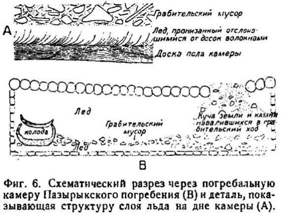 Как уже было отмечено выше, микроклимат могилы не повредил изделиям из дерева и самой погребальной камере, сохранившейся великолепно. Благодаря этому можно реконструировать некоторые детали внутреннего убранства могилы. По периметру стен на вертикально установленных жердях горизонтально крепились тонкие палки, служившие, вероятно, каркасом драпировки стен. Очевидно, внутренняя поверхность стен погребального сруба была завешена войлочными коврами. Цветные войлоки, найденные в мерзлотных курганах Алтая, позволяют предположить, что это могли быть высокохудожественные изделия. Жерди, основания которых были жестко закреплены в специальных пазах, вырубленных в досках пола, служили также для подвешивания некоторых атрибутов погребального ритуала.