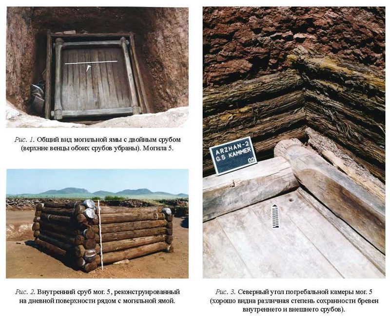 Ниже приведен фрагмент описания кургана Аржан-2 из статьи руководителя Центральноазиатской археологической экспедиции Государственного Эрмитажа (Санкт-Петербург) К.В.Чугунова, проводившего совместно с Германским Археологическим Институтом (Берлин) раскопки погребально-поминального комплекса Аржан-2 в Республике Тыва (Российская Федерация) в начале 2000-х годов (Чугунов, 2004):