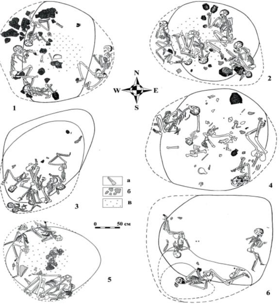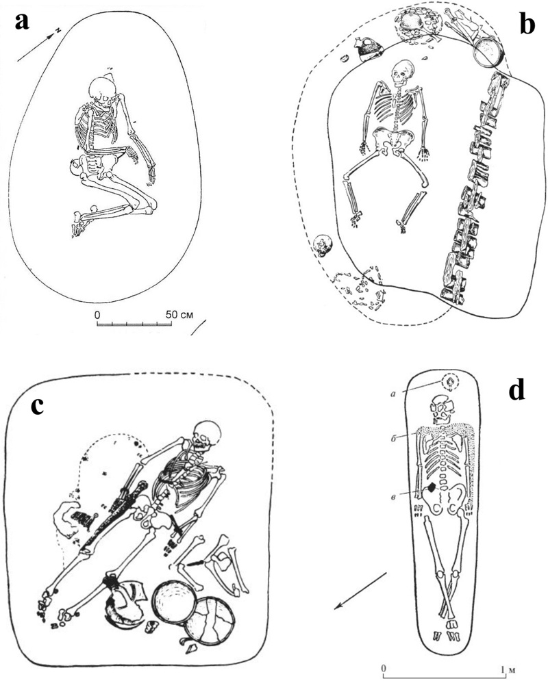 Грунтовые могильники, вероятно, сформировались либо в случае сноса водными потоками плохо закрепленных строений, либо в случае, если люди жили в землянках (Рис. 6d).