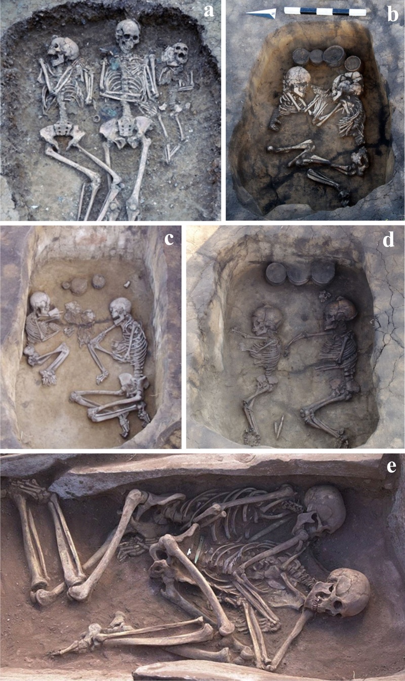 Имеются курганы, служившие семейными кладбищами и содержащие несколько близких по времени могил, есть и коллективные могилы с несколькими скелетами. В богатых могилах довольно часто находятся парные погребения - мужчины и женщины, но встречаются и другие сочетания: мужчины, женщины и ребенка, двух мужчин - пожилого и молодого, ребенка и двух женщин и др. Нет оснований все эти случаи коллективных погребений связывать с ритуальными убийствами, вроде умерщвления жены или наложницы или слуги для сопровождения в загробную жизнь их господина, они могут быть следствием и случайной одновременной смерти членов одной семьи или же, что наиболее вероятно, повторного использования погребальной камеры, что могло иметь место в тех случаях, когда у нее имеется входной коридор. Однако и насильственное умерщвление наложницы или слуги, несомненно, практиковалось и представлено рядом примеров.