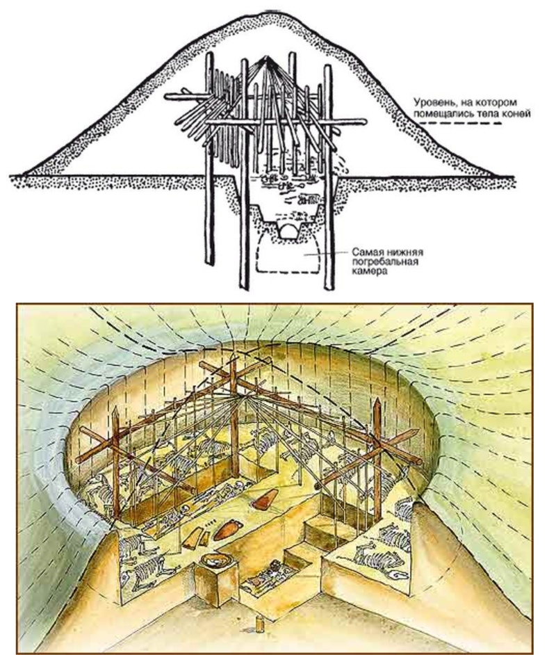 - Еще более непонятно, почему кочевники, которые, как считается, почти все время проводили в войлочных кибитках и юртах, вдруг, ни с того ни с сего, стали хоронить своих собратьев в специально для этого сделанных деревянных срубах из цельных бревен. А иногда и в каменных сооружениях. Степные жители на это вряд ли способны, этому ремеслу надо долго учиться. При этом срубы делались не по размеру покойного, а значительно больше, с полом и потолком. И почему тогда хотя бы в могилы не клали (или ставили) те же юрты для будущей загробной кочевой жизни?