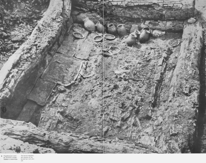 "Большинство могил в Среднем Приднепровье представляет собой четырехугольную яму с входным коридором (дромосом) или без него и с впущенным в нее погребальным сооружением - камерой или склепом. Погребения в насыпи или на грунте относительно редки, и, как правило, они впускные в уже существовавших курганах. Величина могильной ямы находится в прямой зависимости от величины погребального сооружения, а следовательно, от знатности покойника. В больших и средних курганах в могильной яме находят остатки деревянной камеры со столбами по углам, а в особенно больших еще и со столбами посредине каждой из стен. Пространство между столбами вдоль стенок забиралось вертикально поставленными бревнами или плахами с нижними концами, вкопанными в землю; по краям ямы образовывали канавки. Встречаются также могилы со столбами, но без канавок по краям, со следами горизонтальной облицовки стен, вероятно, в виде бревен, положенных между столбами. В могилах, достигающих 30 и более квадратных метров, кроме столбов по углам и стенкам, ставились еще один или два столба в центре. Дно могилы или оставлялось земляным, или покрывалось деревянным настилом. Потолок сооружался из бревен в виде накатника на перекладинах, уложенных на концах столбов. В некоторых случаях над потолком возвышалась крыша, скаты которой далеко выходили за края могилы. В рядовых погребениях меньшей величины наряду с прямоугольными встречаются круглые могилы, как, например, в могильнике у села Холодный Яр близ Смелы. Они тоже облицовывались деревом и перекрывались бревнами, но без столбов. Чаше всего в рядовых могилах прослеживаются только остатки перекрытия в виде наката.