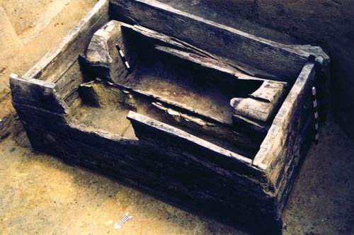При демонтаже бревен между северо-восточными стенками двух срубов обнаружено деревянное блюдо, стоявшее на ребре. Некогда оно имело ремешок для подвешивания, украшенный золотыми обоймами, который был продет в специальное отверстие под краем. Вероятно, оно использовалось в погребальном ритуале для разделки жертвенного мяса, так как на его поверхности отчетливо видны следы от лезвия ножа. За той же северо-восточной стенкой погребальной камеры, в пространстве между бревнами внешнего сруба и бортом могильной ямы стояли два бронзовых котла. Они были обложены каменными плитками.