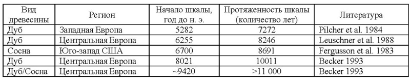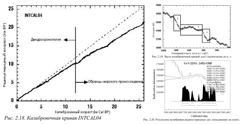 "Чтобы согласовать радиоуглеродное время с календарным, необходимо знать концентрацию радиоуглерода в различные периоды прошлого. Изменения концентрации радиоуглерода в прошлом и отражают так называемые калибровочные кривые. В основе построения калибровочной кривой лежат измерения концентрации радиоуглерода в образцах с известным календарным возрастом. Идеальными образцами являются годичные кольца деревьев, возраст которых может быть определен дендрохронологически. История создания калибровочных кривых с использованием датирования годичных колец деревьев началась с 1980-х годов и подробно описана в главе 1. Калибровочная кривая INTCAL 04 представлена на рис. 2.18: часть ее, протяженностью 12000 лет, получена на основе дендрообразцов и охватывает весь голоцен; далее калибровочная кривая построена на основе различных образцов, в основном морского происхождения: морских кораллов, фараменифер и различных отложений, датированных как радиоуглеродным, так и уран-ториевым (U/T) методами (Bard, Arnold et al. 1993; 1998; Burr et al. 1998)".