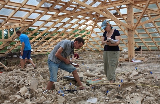 Рис. 32. Кладбище костей мамонта (верхний снимок) и разрез рыхлых отложений (нижний снимок) в музее-заповеднике "Костенки". http://kostenki-museum.ru.