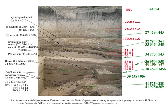 В подобных случаях надо внимательно определить положение стоянки относительно пород отложенных водами Потопа. И иметь в виду аргументацию о происхождении подобного типа отложений, приведенную в предыдущем разделе (каждая точка в разрезе дает свой возраст). Что скорее всего и фиксируют результаты работ приведенные на Рис. 32, внизу. А на самом деле вся эта толща образовалась в короткий промежуток времени во время Потопа. Это та же широко распространенная в регионе пачка лёссовидных пород.
