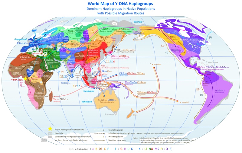 Приведём несколько примеров возможной интерпретации современного распространения гаплогрупп с позиции "потопной концепции". Так, опустевшую территорию Византийской империи, неторопливо, без всяких войн и резни заселили никому до того не известные представители тюркской расы, выжившие в горных массивах центральной Азии. Для представителей греческой расы, которые были расселены по всему Средиземноморью, ситуация сложилась по другому, территорией их проживания осталась только сама Греция. Видно они спаслись на Олимпе и после Потопа никуда уже особо не стремились. Возрождение Западной Европы произошло за счет спасшихся людей в Альпах. Присутствие на Мадагаскаре доминирующей гаплогруппы, отличной от африканских, можно объяснить смывом и перемещением людей с островов юго-восточной Азии водными потоками, доминирующее направление которых было с востока на запад. И так можно "докопаться" до "исходной точки распространения" всех основных гаплогрупп.