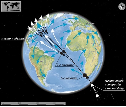Первая, неточность, которая сразу бросается в глаза, это пологий вид траектории касания астероидом поверхности планеты. Такое утверждение неверно, в виду того, что при вхождении астероида в сферу тяготения Земли, это расстояние ~260 тыс. км, его траектория начнёт искривляться. Потому что, к вектору скорости движения астероида добавится вектор гравитационного ускорения, которое по мере приближения к планете будет нарастать.