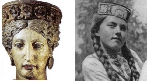 А на голову скульптуры этрусской богини водружён обыкновенный русский кокошник, который носили в деревнях Российской Империи: