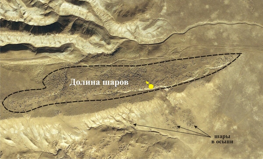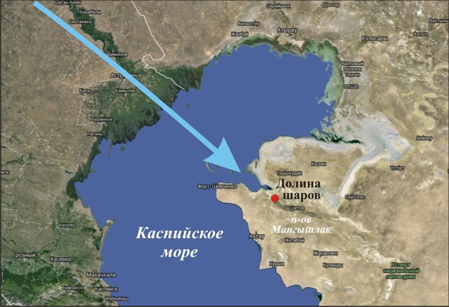 В статье "Как ихтиофауна северных морей попала в Черное и Каспийское море" на Рис. 2 были показаны направления движение водных потоков от эпицентра катастрофы по территории Европы. Так вот, если продолжить линию № 3 на схеме, то мы как раз попадаем на п-ов Мангышлак, где находится широко известная Долина шаров в урочище Торыш в Казахстане.
