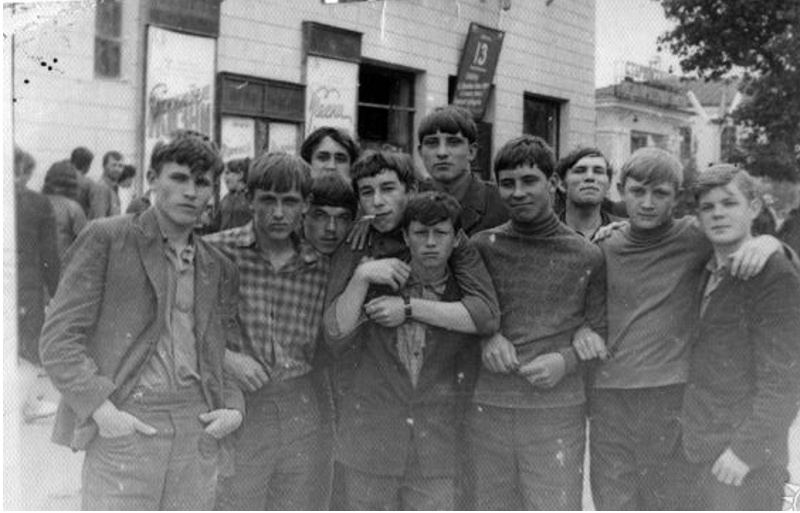 Старо Оскольский геологразведочный техникум (СОГРТ). Моя группа (каротажники) у кинотеатра. 1970 г.
