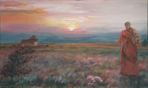 Он не пришел бы утром, если идти было недалеко, и т.к. ночью не ходят, лучше поторопиться и прийти вечером! В душе у него, конечно, целая буря чувств и кроме радости, надежды, что отражает яркое вечернее солнце, пробивающееся сквозь тучи, присутствует и тревога за всех тех, кого он оставил на долгие годы - раньше каникул не было. Это и думы о родине, о братьях, гелюнгах, о людях, своей степи, что всегда была полем битвы еще. Как они, что с ними, живы ли? Да, что-то и навевало тревогу в процессе создания картины в подборе красок, иногда интуитивно, они сгущаются, подчиняясь какой-то силе, неподвластной художнику, а может и есть это судьба, которая диктует свыше сюжет и колорит!? Странно, только ты это заметил среди созерцателей - подтекст смутного беспокойства, наряду со светлой радостью встречи - лилово-красные оттенки борьбы, тревоги, войны. У художника всегда в душе присутствует тревога, переживания, недовольство собой, сомнения, он должен тонко чувствовать время свое, настоящее и предвидеть даже будущие катаклизмы, иначе он не художник, а просто ремесленник. Ведь летопись войн никогда не прекращалась во всю историю человека, и мир наш беззаботного детства и будущего коммунизма быстро исчез, обнажив многое, в сущности. Так что целая гамма чувств переполняет человека в такие минуты, ведь и он сам целая планета, что и сам себя не знает до конца, не говоря уже о мироздании. О любом произведении живописи, скульптуры, литературы можно долго говорить, я уже отмечал раньше, что многое зависит не только от художника, создателя, но и воспринимающего произведение. Я рад, что ты много увидел в картине и подробно поделился своими впечатлениями об этом!