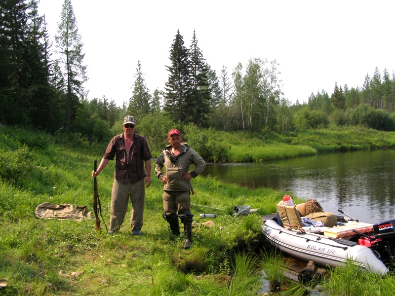 Закончив через пару недель наши труды, мы поднялись по реке километров 15-20 к базе местных геологов, откуда нас должен был с "оказией" забрать их борт в пос. Первореченск.