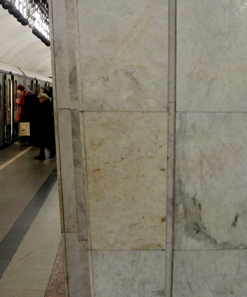 Стены и колонны многих станций московского метрополитена облицованы белым мрамором, на отшлифованной поверхности которого наблюдаются сероватые бесформенные пятна различной величины от нескольких до десяток сантиметров.