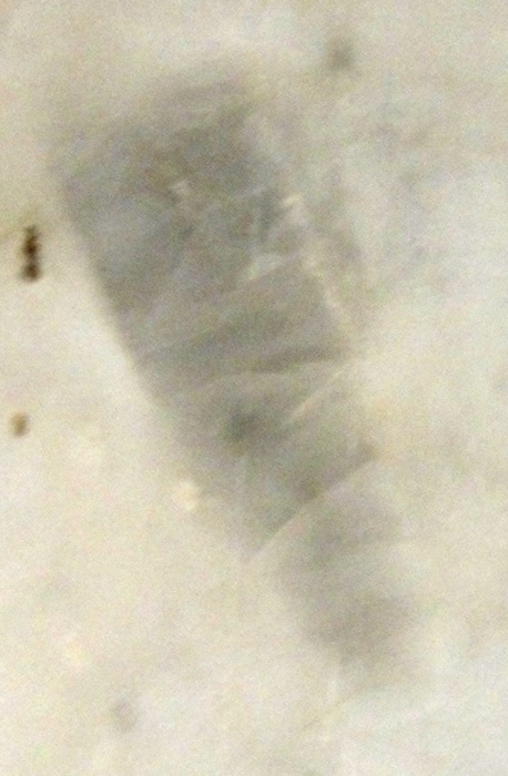 Размер пятна серого цвета на взгляд имеет несколько см в длину и более см в ширину, с чёткой линиией контура.
