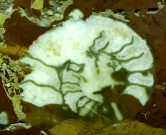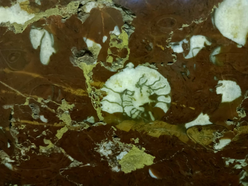 Аналогичным же пятнистым мрамором с Нижнего Тагила облицованы стены платформы станции "Проспект Мира кольцевая" в котором мне удалось четыре года назад в 2020 году определить фрагменты двустворчатых раковин моллюсков с концентрическими линиями рёбер как тип брахиопод.