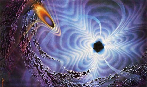 - На борту моего разведчика. Наш корабль периодически, так сказать, "прыгает" на определённое расстояние, в каждой точке наблюдения мы замеряем различные характеристики материи и силовых полей. После последнего перемещения корабль вынырнул у странного провала пространства, его бесформенные подвижные границы отчётливо прорисовывались на фоне светящегося галактического ядра. И нас стремительно потянуло в эту тёмную пропасть.