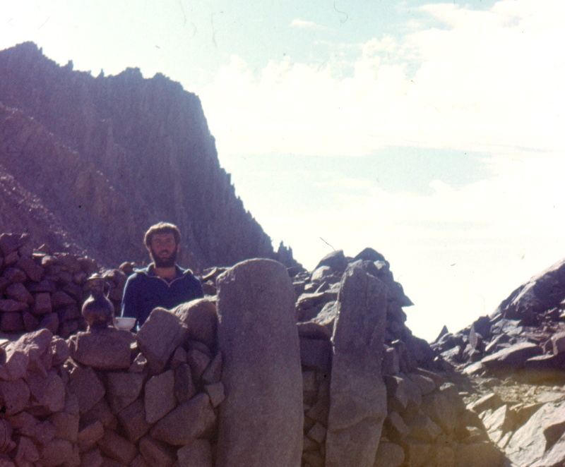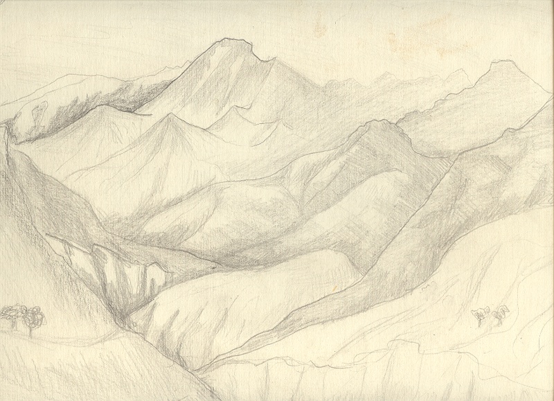 (Рисунок автора с натуры) Аксакалы, после обязательного обмена любезностями категорически потребовали от начальника, чтобы мы убрали поросёнка: "ЧушкА, (с ударением на А), очень плохо. Арык течёт в кишлак, мы берём воду из него, а тут чушкА. Это нельзя. Увозите свою чушкУ отсюда". Наш начальник был опытным дипломатом. Он долго пил с аксакалами чай и, в конце концов, отстоял поросёнка, заверив, что для него будет построен загон из досок без щелей далеко от сада, и чушка будет сидеть в этом коробе безвылазно. А для отходов рядом выкопаем глубокую яму, которую перед убытием закопаем. Да и будем здесь всего неделю. Всё лето мы возили нашу чушкУ с собой, с любовью кормили, поили и ухаживали. В конце сентября, когда я покидал славные горы Карамазар, это уже был упитанный кабанчик. После случая с бражкой, я его особо ублажал в благодарность, что он не откинул тогда свои маленькие копытца. Как сложилась в дальнейшем его судьба, мне не ведомо. *** Та "олимпийская" практика была очень значимой. Во-первых, я побывал на настоящих горах, четыре месяца, почти ежедневно утюжил склоны и вершины на высотах от трёх тысяч и более метров. Конечно, для альпинистов это высоты так себе - семечки, но мы ежедневно уходили вверх, с превышением до тысячи метров и возвращались в лагерь гружённые тяжёлыми рюкзаками, набитыми пробами и образцами. Изнурённым и потным нам было не до романтики.