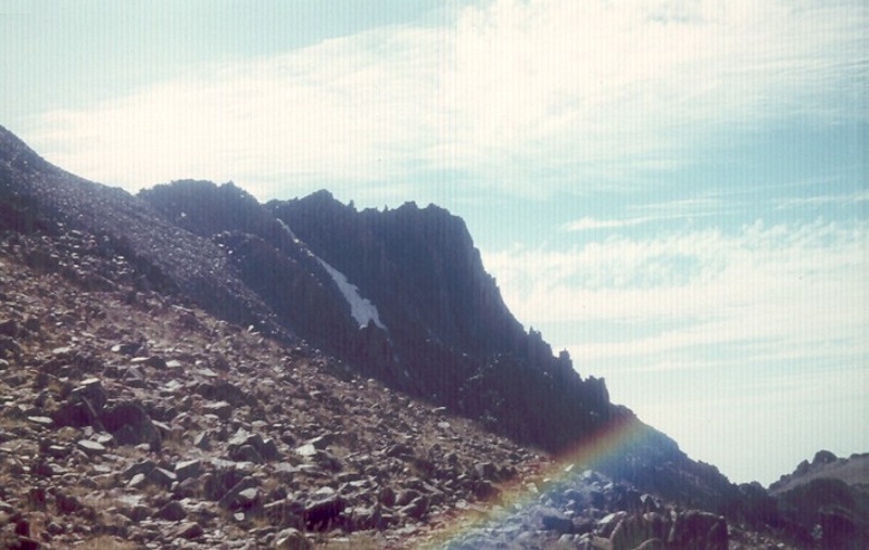 *** Название "Кара мазар" переводится на русский язык, как "Чёрная могила". В одном из маршрутов я набрёл на эту самую могилу, которая находится на одной из вершинок хребта. Она представляет собой курган высотой до двух метров сложенный из камней. В кургане внизу сбоку имеется узкий проход внутрь, завешенный белыми лоскутами материи, может быть это остатки истрёпанного полога. Кое-где в камни воткнуты веточки с привязанными тряпочками, а сбоку торчит высокий шест в наклонённом положении, тоже увязанный обрывками материи, вероятно, раньше он стоял вертикально и завалился со временем. Выглядит это место заброшенным, тряпочки на веточках почти истлели. Думаю, за многие прошедшие годы, а может быть и десятилетия, я с рабочим стали единственными "паломниками", кто посетил "чёрную могилу", давшей название хребту. Кто-то рассказывал, что на горе похоронен какой-то святой. Почему его похоронили высоко в горах не известно. На фотографии (со слайда) отчётливо видны два столба света, исходящих в небо от могилы. Вероятно это дефект проявления плёнки, но с другой стороны эти осветления видны только на фоне неба, а ниже на фоне камней их нет. К тому же они неоднородны по текстуре, а дефект проявки должен был проходить через весь кадр и быть однородным. В общем, мистика, да и только.