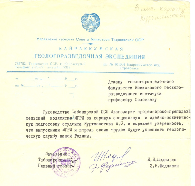 *** Ровно через четыре месяца 20-ого сентября я покинул горы и выбрался в контору партии для увольнения. Перед убытием в родные МГРИ, главный геолог партии показал мне коробку дома только что построенного недалеко от конторы, толи 3-х, толи 4-х этажного, уже не помню, и сказал: - Через год будет готов. Выбирай прямо сейчас любую квартиру и приезжай после окончания к нам в Табашарскую партию.