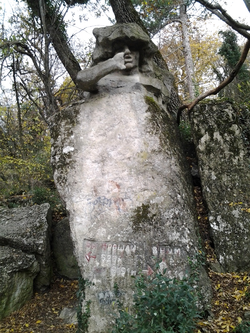 Дошли до Крестовой горы, это два км от начала тропы, на скалы к крестам тропу не нашли - склоны крутые в расселинах и завалены глыбами серого известняка. Блуждали между скал, пока не поднялись на вершину. Посмотрели на кресты с высоты. После чего благополучно вернулись в санаторий.