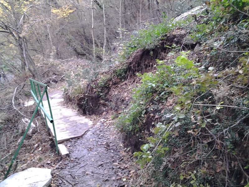 Фрагменты сползающего грунта размером до 10 м. Стволы деревьев, перегородившие тропу, спилили и убрали, а через провал на тропе перебросили хилый мостик.