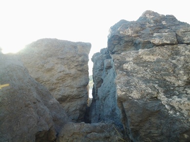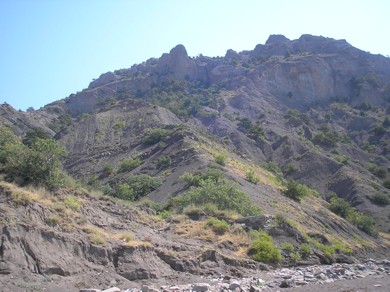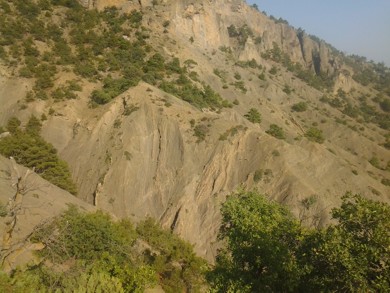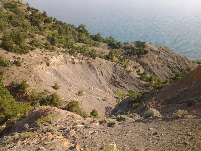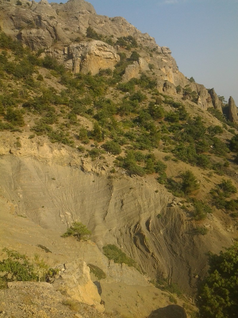 Естественно, в один из дней, часиков в пять после полудня, когда жара спала, я полез на склон горы с ознакомительным маршрутом, полюбоваться вблизи на крутопадающие слои антиклинальной складки, срезанные в верхней части, будто бритвой, пачкой пологозалегающих пород.