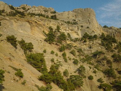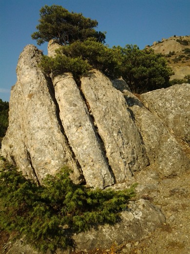 Зубчатые скалы западного склона горы Караул-Оба разбиты глубокими трещинами и украшены карликовыми соснами и кустами можжевельника. Причём деревца растут прямо на скалах, принимая причудливые формы.