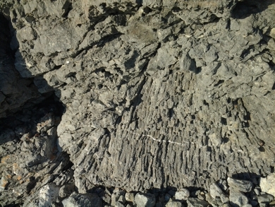 Сверху коралловый риф перекрыт крутопадающими слоями осадочных пород, которые в свою очередь срезаны пологозалегающей толщей бурых, похожих на кирпичную кладку песчаников. В общем, вся эта мешанина разрывающих друг друга пород обнажена до неприличности и просматривается как на ладони.