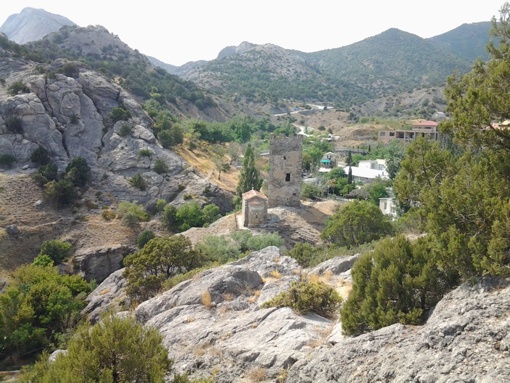 ГЕНУЭЗСКАЯ КРЕПОСТЬ, ОТВЕТСНЫЕ СКАЛЫ И ДРУГИЕ ПРЕЛЕСТИ ГОРОДА СУДАК НА БЕРЕГУ ЮГО-ВОСТОЧНОГО КРЫМА часть 3. БАШНЯ ФРЕДЕРИКО АСТАГВЕРА И ЧАСОВНЯ ДВЕНАДЦАТИ АПОСТОЛОВ НА ОДИНОКОЙ СКАЛЕНа дне глубокой долины между горами крепостной горы Кыз-Куле-Бурун и двуглавой горы Палвани-Оба (Болван) над излучиной бухты стоит невысокая, но с отвесными стенами скала, омываемая с обеих сторон водами пересыхающей горной речушки. На вершине этой скалы, словно игрушечные красуется "сладкая парочка" - стройная башня и приземистое строение православной часовни. Доступ к башне в отличие от крепостных строений свободен, а часовня открыта для посещения два раза в неделю до обеда.