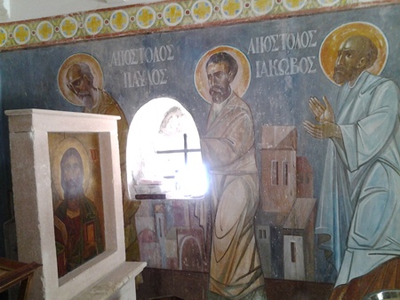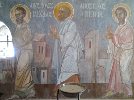Боковые стены Храма, включая входную, внутри расписаны идущими к алтарю апостолами.