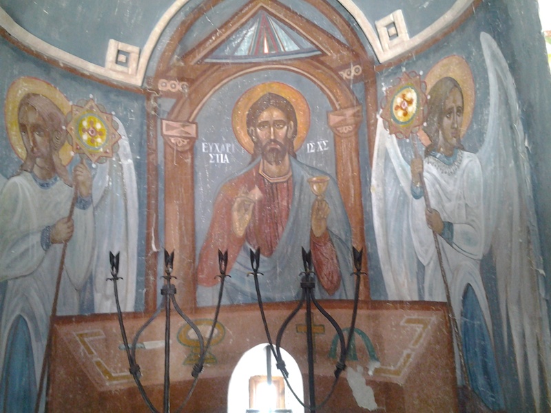Фреска на полукруглой стене алтаря, изображающая Иисуса Христа с ангелами по сторонам, благословляющего апостолов.