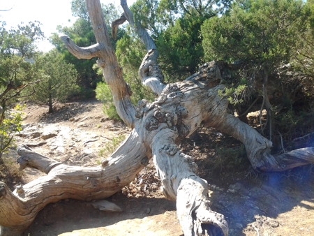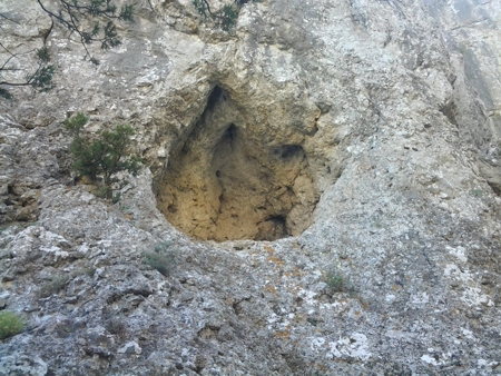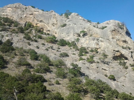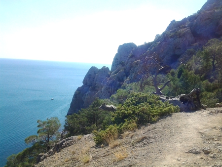 Тропа вновь стала широкой, словно грунтовая дорога. Но в конце долины она веером разбилась на несколько тропинок. Одна явно уходила к вершине горы, одна, наиболее широкая ныряла в ущелье. Решив, что это есть спуск с перевала, я двинулся по ней. Пройдя метров сто по дну ущелья, я оказался на краю многометровой пропасти, спуститься с которой не было ни какой возможности. Чертыхаясь, я побрёл наверх и отправился вдоль склона по одной из тропинок и конечно оказался на краю бездонного обрыва. Вернувшись немного назад, я отправился по другой тропинке, забирая вверх, рассчитывая, что уж там-то будет спуск. Но, увы, под ногами вновь оказалась пропасть. Так я напрасно мыкался по склону, выбиваясь из сил, в поисках спуска. Вернувшись со склона горы в Долину Рая, я уже малодушно решил возвращаться обратной дорогой, против чего восставало всё моё естество. И ... двинулся по тропе, ведущей в ущелье, и естественно оказался у знакомого обрыва, между двух вертикальных стен. Стоя на краю и поглядывая вниз и по сторонам, я обратил внимание, что справа на стене есть отдельные уступчики, на которые можно было поставить ногу, а метра через полтора я разглядел на скале более-менее узкий проход, похожий на тропу. Делать нечего, не идти же снова назад. И вжимаясь в гладкую и тёплую поверхность скалы я, умело преодолел-таки каверзный участок, не свалившись вниз в бездонную пропасть. Дальше было проще, помогая себе палкой, я осторожно спускался вниз, иногда разгадывая ребусы, куда поставить ногу, а куда палку. А добравшись до моря, долго-долго лежал в прозрачных тёплых волнах прекраснейшей и знакомой уже Кутлакской бухты.