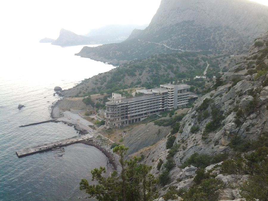 Недостроенный санаторий "Дельфин". Законсервирован, в окнах есть стёкла, охраняется. Огромный по размерам, напоминает корабль. Стоит прямо в десятках метрах от прибоя, что не положено по санитарным нормам. Если достроят, то вся канализация будет в чистейших водах этой бухты.