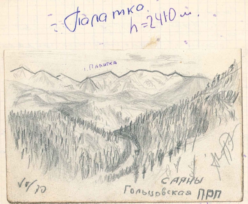 Партия базировалась в посёлочке на седловине между "гольцами" на высоте примерно 1 500 м. Гольцами здесь называют сопки с обнажённой каменистой вершинной и крутыми склонами, покрытыми кедрами.
