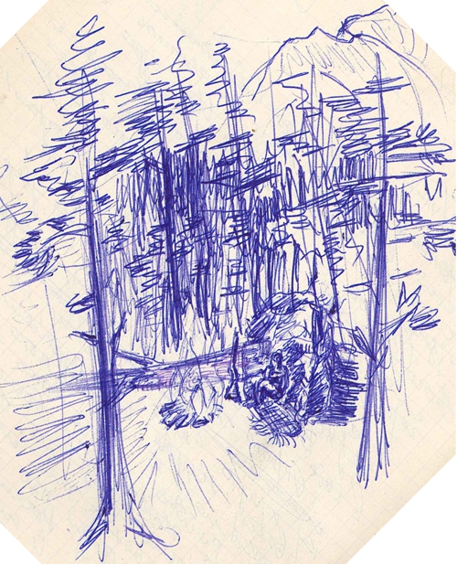 Уже вечерело, я спохватился и бросился бегом вниз. Стремительно спускались сумерки и я, сокращая путь, двинулся по склону по осыпи, перепрыгивая с камня на камень, рискуя расшибиться. Уже в потёмках я добрался до сухостоя у кромки осыпи. Совсем недалеко, где-то внизу было моё лежбище, но спускаться в кромешной тьме я не рискнул. Стал устраивать ночёвку, запасая дрова, ломая об валун небольшие сушины. Потом устроив костёр, я позволил себе расслабиться. Достал банку сгущёнки и, пробив в ней пару дырочек, с удовольствием высосал всё содержимое. Склон был весьма крутой, поэтому соорудив из камней упор для ног, что бы ни скатиться вниз, я прикорнул. Было довольно холодно, я чуть дремал, то и дело возобновлял прогоревший костёр, больше опасаясь медведя, который, по словам охотника Рябова здесь обитал, чем холода. Всё же под утро я заснул так крепко, что закатился в прогоревший костёр спиной. Но, вовремя спохватился, и через время, выщипав последние кусочки тлеющей ваты из телогрейки, я спустился вниз к своему лежбищу.