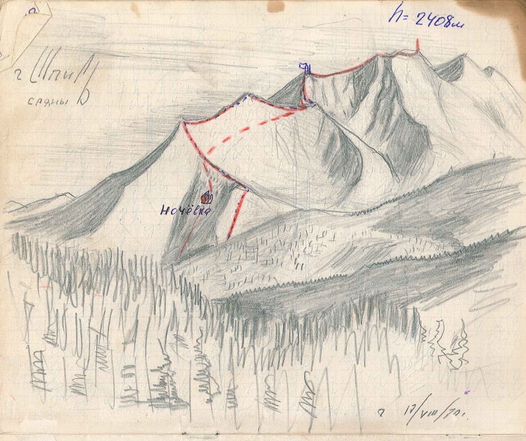 После обеда ближе к вечеру, уставший "весь в мыле", добрался, наконец, до избушки Рябова, который, как говорили, жил здесь более двух десятков лет. Сухопарый старик встретил меня приветливо. Но когда узнал про мою затею, то нахмурился, и начал меня, чуть ли не руганью отговаривать, мол погода плохая, и на Шпиле нет ничего хорошего, вершина вся в облаках и можно сорваться с крутых скал, да к тому же, там живёт медведь. Тем не менее, он сытно накормил и приютил на ночь.