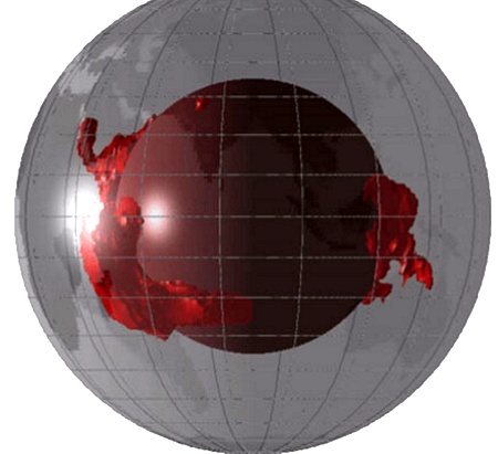 Таинственные волны (красные), движущиеся через внешний слой ядра Земли (Фото: ESA/Planetary Visions) | |