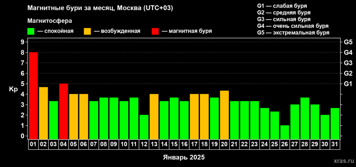 Новый 2025 год начался очень сильной магнитной бурей. Она бушевала 1 января весь день, достигнув к вечеру уровня G4 (max уровень равен G5).
